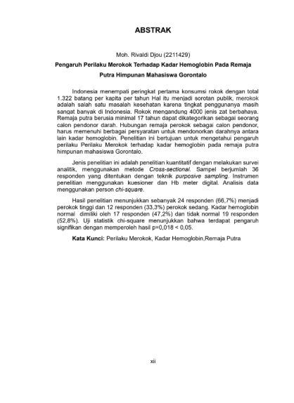 Djou, Moh. Rivaldi and Rahmatullah, Widia and Arsita, Emilia Vivi (2025) PENGARUH PERILAKU MEROKOK TERHADAP KADAR HEMOGLOBIN PADA REMAJA PUTRA HIMPUNAN MAHASISWA GORONTALO. Diploma thesis, Politeknik Kesehatan Bhakti Setya Indonesia.