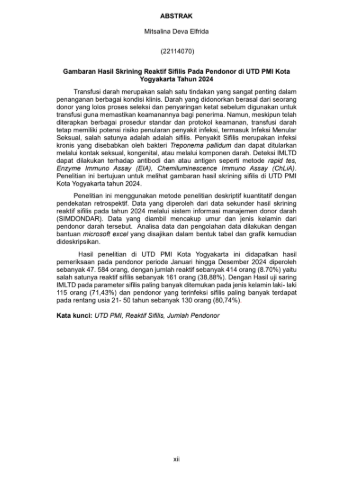 Transfusi darah merupakan salah satu tindakan yang sangat penting dalam penanganan berbagai kondisi klinis. Darah yang didonorkan berasal dari seorang donor yang lolos proses seleksi dan penyaringan ketat sebelum digunakan untuk transfusi guna memastikan keamanannya bagi penerima. Namun, meskipun telah diterapkan berbagai prosedur standar dan protokol keamanan, transfusi darah tetap memiliki potensi risiko penularan penyakit infeksi, termasuk Infeksi Menular Seksual, salah satunya adalah adalah sifilis. Penyakit Sifilis merupakan infeksi kronis yang disebabkan oleh bakteri Treponema pallidum dan dapat ditularkan melalui kontak seksual, kongenital, atau melalui komponen darah. Deteksi IMLTD dapat dilakukan terhadap antibodi dan atau antigen seperti metode rapid tes, Enzyme Immuno Assay (EIA), Chemiluminescence Immuno Assay (ChLiA). Penelitian ini bertujuan untuk melihat gambaran hasil skrining sifilis di UTD PMI Kota Yogyakarta tahun 2024.
