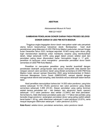 Al Farizi, Abdussamad Attusuri and Rahmatullah, Widia and Mara, Errisa Malsuritadevi (2025) GAMBARAN PENOLAKAN DONOR DARAH PADA PROSES SELEKSI DONOR DARAH DI UDD PMI KOTA MADIUN. Diploma thesis, Politeknik Kesehatan Bhakti Setya Indonesia.