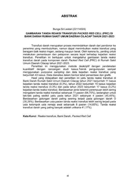 Lestari, Bunga Sri and Hartini, Windadari Murni and Rosyidah, Rudina Azimata (2025) GAMBARAN TANDA REAKSI TRANSFUSI PACKED RED CELL (PRC) DI BANK DARAH RUMAH SAKIT UMUM DAERAH CILACAP TAHUN 2021-2023. Diploma thesis, Politeknik Kesehatan Bhakti Setya Indonesia.