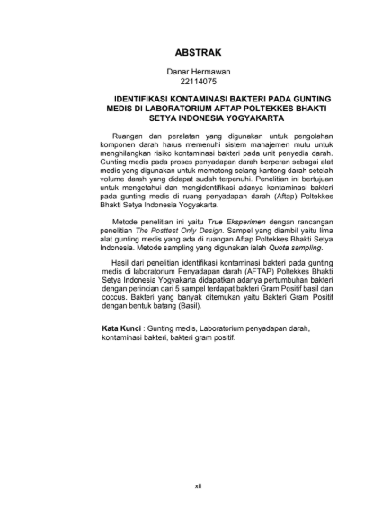 Ruangan dan peralatan yang digunakan untuk pengolahan komponen darah harus memenuhi sistem manajemen mutu untuk menghilangkan risiko kontaminasi bakteri pada unit penyedia darah. Gunting medis pada proses penyadapan darah berperan sebagai alat medis yang digunakan untuk memotong selang kantong darah setelah volume darah yang didapat sudah terpenuhi. Penelitian ini bertujuan untuk mengetahui dan mengidentifikasi adanya kontaminasi bakteri pada gunting medis di ruang penyadapan darah (Aftap) Poltekkes Bhakti Setya Indonesia Yogyakarta.