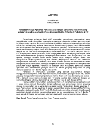 Hasil analisa dengan uji Man-Whitney didapatkan nilai signifikansi p: 0,067 (p >0,05). Kesimpulan penelitian ini adalah tidak terdapat perbedaan derajat aglutinasi yang signifikan pada tes sel yang disimpan hari ke-1 dan ke-7 pada suhu 2-8°C pada pemeriksaan golongan darah ABO serum grouping metode tabung.