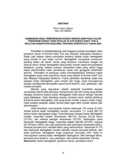 Adjami, Fitria Yuliani and Rosyidah, Rudina Azimata and Setianingsih, Ika Sulis (2025) GAMBARAN HASIL PEMERIKSAAN KADAR HEMOGLOBIN PADA CALON PENDONOR DARAH YANG DITOLAK DI UTD RUMAH SAKIT TANI & NELAYAN KABUPATEN BOALEMO, PROVINSI GORONTALO TAHUN 2024. Diploma thesis, Politeknik Kesehatan Bhakti Setya Indonesia.