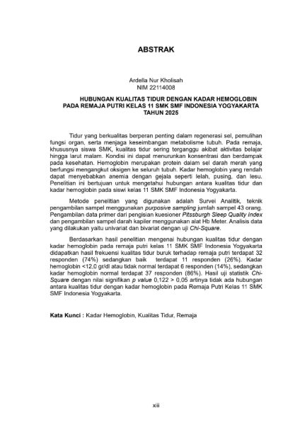 Kholisah, Ardella Nur and Hartini, Windadari Murni and Mawardi, M. Imron (2025) HUBUNGAN KUALITAS TIDUR DENGAN KADAR HEMOGLOBIN PADA REMAJA PUTRI KELAS 11 SMK SMF INDONESIA YOGYAKARTA TAHUN 2025. Diploma thesis, Politeknik Kesehatan Bhakti Setya Indonesia.