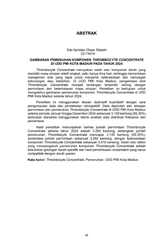Thrombocyte Concentrate merupakan salah satu komponen darah yang memiliki masa simpan relatif singkat, yaitu hanya lima hari, sehingga memerlukan manajemen stok yang tepat untuk menjamin ketersediaan dan mencegah kekurangan atau kelebihan. Di UDD PMI Kota Madiun, pengelolaan stok Thrombocyte Concentrate menjadi tantangan tersendiri seiring dengan permintaan dan keterbatasan masa simpan. Penelitian ini bertujuan untuk mengetahui gambaran pemenuhan komponen Thrombocyte Concentrate di UDD PMI Kota Madiun selama tahun 2024.