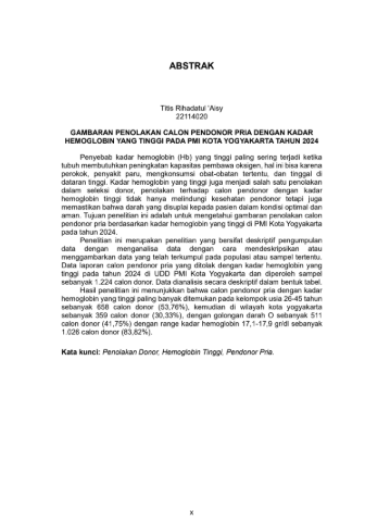 'Aisy, Titis Rihadatul and Aini, Resmi and Astarini, Dian Eko (2025) GAMBARAN PENOLAKAN CALON PENDONOR PRIA DENGAN KADAR HEMOGLOBIN YANG TINGGI PADA PMI KOTA YOGYAKARTA TAHUN 2024. Diploma thesis, Politeknik Kesehatan Bhakti Setya Indonesia.