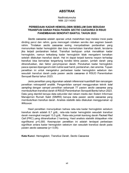 Sectio caesarea adalah operasi untuk melahirkan bayi melalui insisi pada dinding perut dan rahim, guna mencegah robekan serviks dan segmen bawah rahim. Tindakan sectio caesarea sering menyebabkan perdarahan yang menurunkan kadar hemoglobin dan bisa memerlukan transfusi darah, terutama jika terjadi perdarahan hebat. Transfusi bertujuan untuk menaikkan kadar hemoglobin, namun terkadang kadar hemoglobin tidak mengalami kenaikan setelah dilakukan transfusi darah. Hal ini dapat terjadi karena respon terhadap transfusi bisa bervariasi tergantung kondisi klinis pasien, jumlah darah yang ditransfusikan, dan faktor penyimpanan darah. Perubahan kadar hemoglobin pasca operasi dipengaruhi oleh nutrisi saat hamil, perdarahan, dan anemia. Tujuan penelitian ini untuk mengetahui perbedaan kadar hemoglobin sebelum dan sesudah transfusi darah pada pasien sectio caesarea di RSUD Panembahan Senopati Bantul tahun 2023.