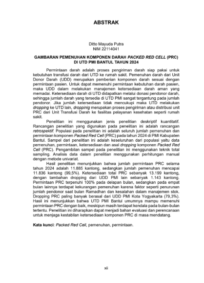 Hasil penelitian menunjukkan bahwa jumlah permintaan PRC selama tahun 2024 adalah 11.885 kantong, sedangkan jumlah pemenuhan mencapai 11.836 kantong (99,5%). Ketersediaan total PRC sebanyak 13.199 kantong, dengan tambahan dropping dari UDD PMI lain sebanyak 1.143 kantong. Permintaan PRC terpenuhi 100% pada delapan bulan, sedangkan pada empat bulan lainnya terdapat kekurangan pemenuhan karena faktor seperti penurunan jumlah pendonor saat bulan Ramadhan dan kesalahan dalam manajemen stok. Dropping PRC paling banyak berasal dari UDD PMI Kota Yogyakarta (79,3%). Hasil ini menunjukkan bahwa UTD PMI Bantul umumnya mampu memenuhi permintaan PRC dengan baik, meskipun masih terdapat kendala pada bulan-bulan tertentu. Penelitian ini diharapkan dapat menjadi bahan evaluasi dan perencanaan untuk menjaga kestabilan ketersediaan komponen PRC di masa mendatang.