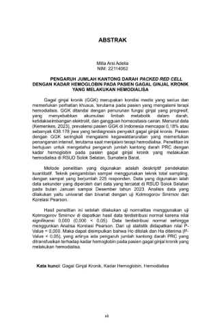 Gagal ginjal kronik (GGK) merupakan kondisi medis yang serius dan memerlukan perhatian khusus, terutama pada pasien yang mengalami terapi hemodialisis. GGK ditandai dengan penurunan fungsi ginjal yang progresif, yang menyebabkan akumulasi limbah metabolik dalam darah, ketidakseimbangan elektrolit, dan gangguan homeostasis cairan. Menurut data (Kemenkes, 2023), prevalensi pasien GGK di Indonesia mencapai 0,18% atau sebanyak 638.178 jiwa yang terdiagnosis penyakit gagal ginjal kronis. Pasien dengan GGK seringkali mengalami kegawatdaruratan yang memerlukan penanganan intensif, terutama saat menjalani terapi hemodialisa. Penelitian ini bertujuan untuk mengetahui pengaruh jumlah kantong darah PRC dengan kadar hemoglobin pada pasien gagal ginjal kronik yang melakukan hemodialisa di RSUD Solok Selatan, Sumatera Barat.