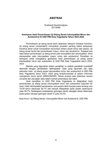 Novitriningtyas, Susilowati and Rosyidah, Rudina Azimata and Hartini, Windadari Murni (2025) GAMBARAN HASIL PEMERIKSAAN UJI SILANG SERASI INKOMPATIBEL MINOR DAN AUTOKONTROL DI UDD PMI KOTA YOGYAKARTA TAHUN 2023-2024. Diploma thesis, Politeknik Kesehatan Bhakti Setya Indonesia.